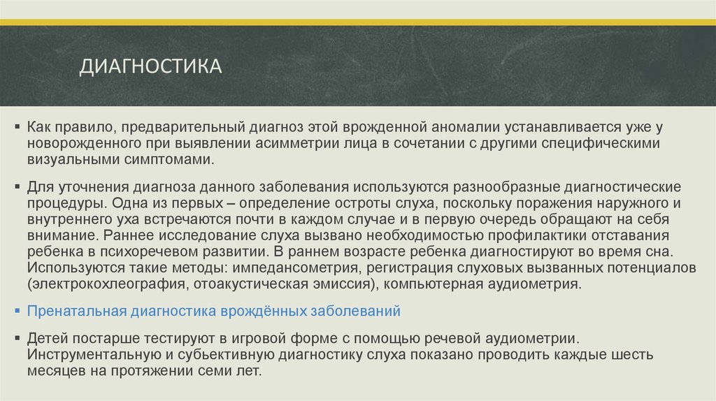 Как правило, предварительный диагноз этой врожденной аномалии устанавливается уже уноворожденного при выявлении асимметрии лица в сочетании с другими специфическими