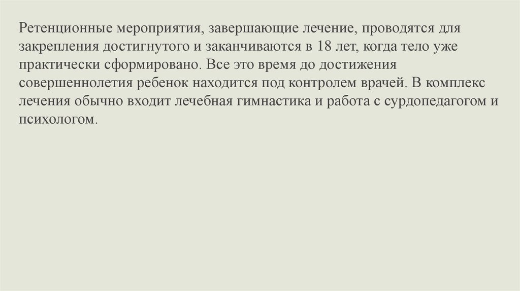 Ретенционные мероприятия, завершающие лечение, проводятся длязакрепления достигнутого и заканчиваются в 18 лет, когда тело уже