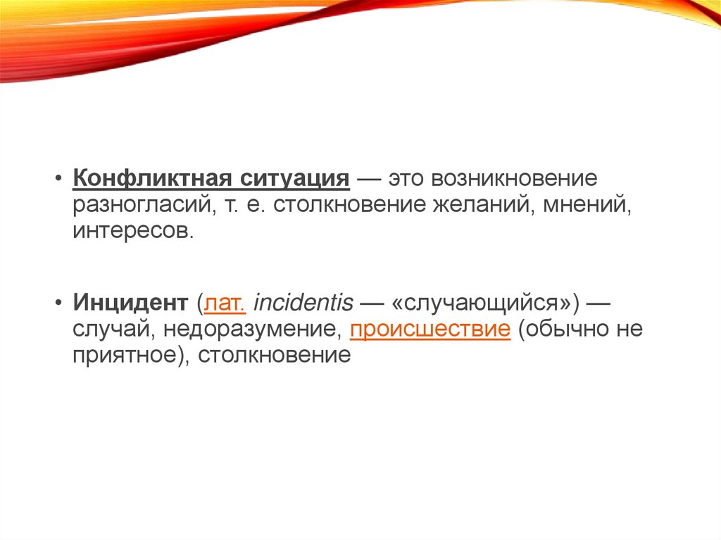 • Конфликтная ситуация — это возникновениеразногласий, т. е. столкновение желаний, мнений,