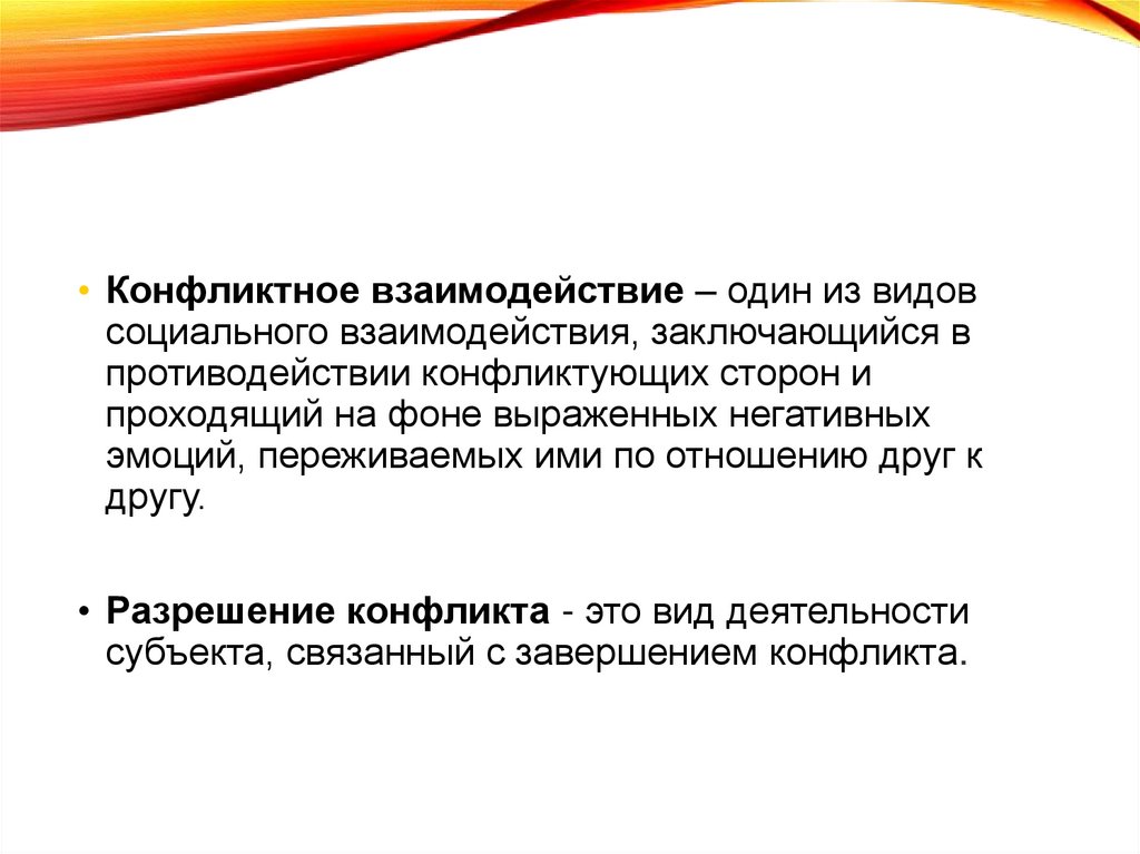 • Конфликтное взаимодействие – один из видовсоциального взаимодействия, заключающийся в