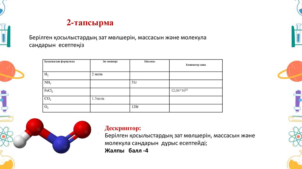 2-тапсырмаБерілген қосылыстардың зат мөлшерін, массасын және молекула