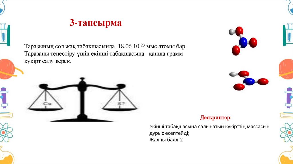 3-тапсырмаТаразының сол жақ табақшасында 18.06 10 23 мыс атомы бар.
