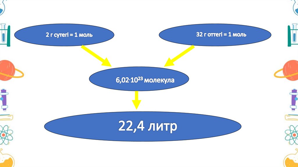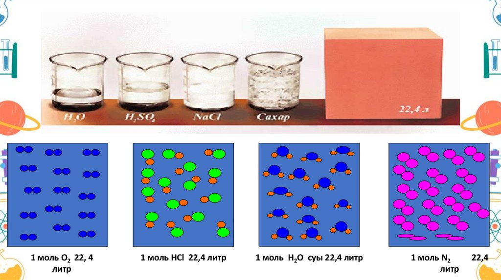 қысымда (101,325 кПа) кез келген газдың бір молі 24 л көлем алады.
