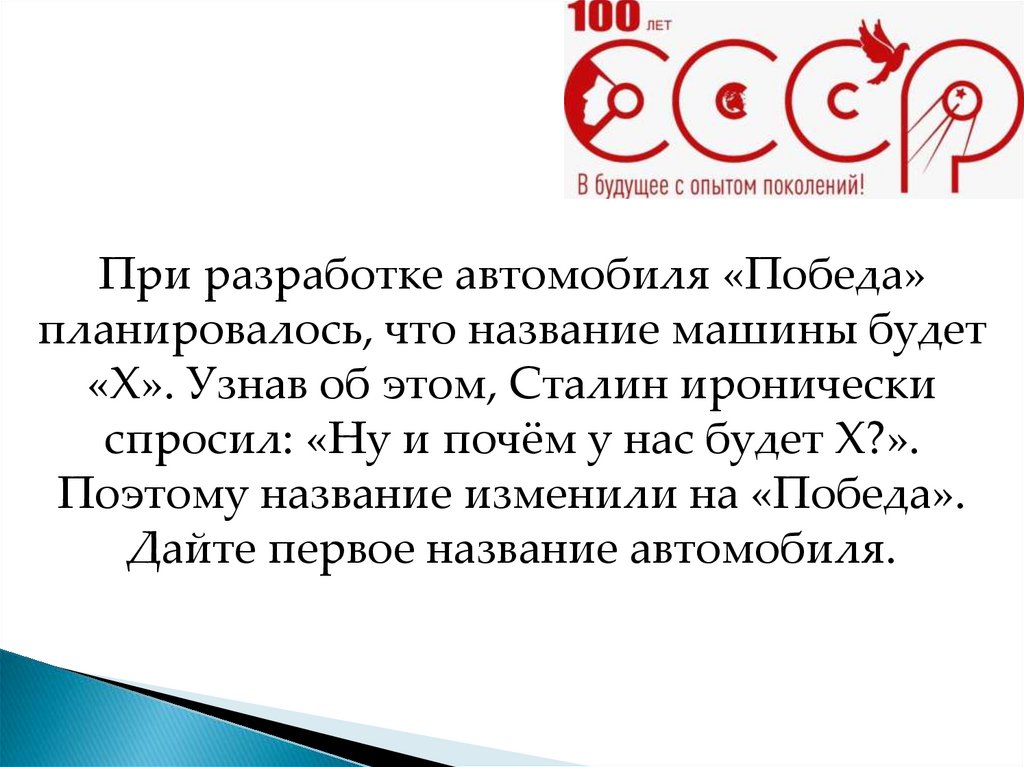 При разработке автомобиля «Победа»планировалось, что название машины будет