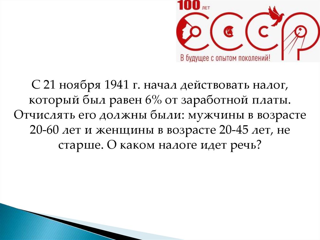 С 21 ноября 1941 г. начал действовать налог,который был равен 6% от заработной платы.