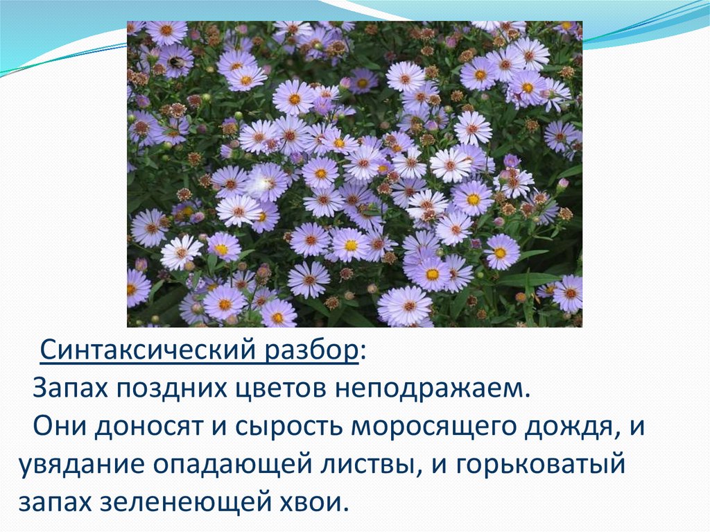 Синтаксический разбор:Запах поздних цветов неподражаем.
