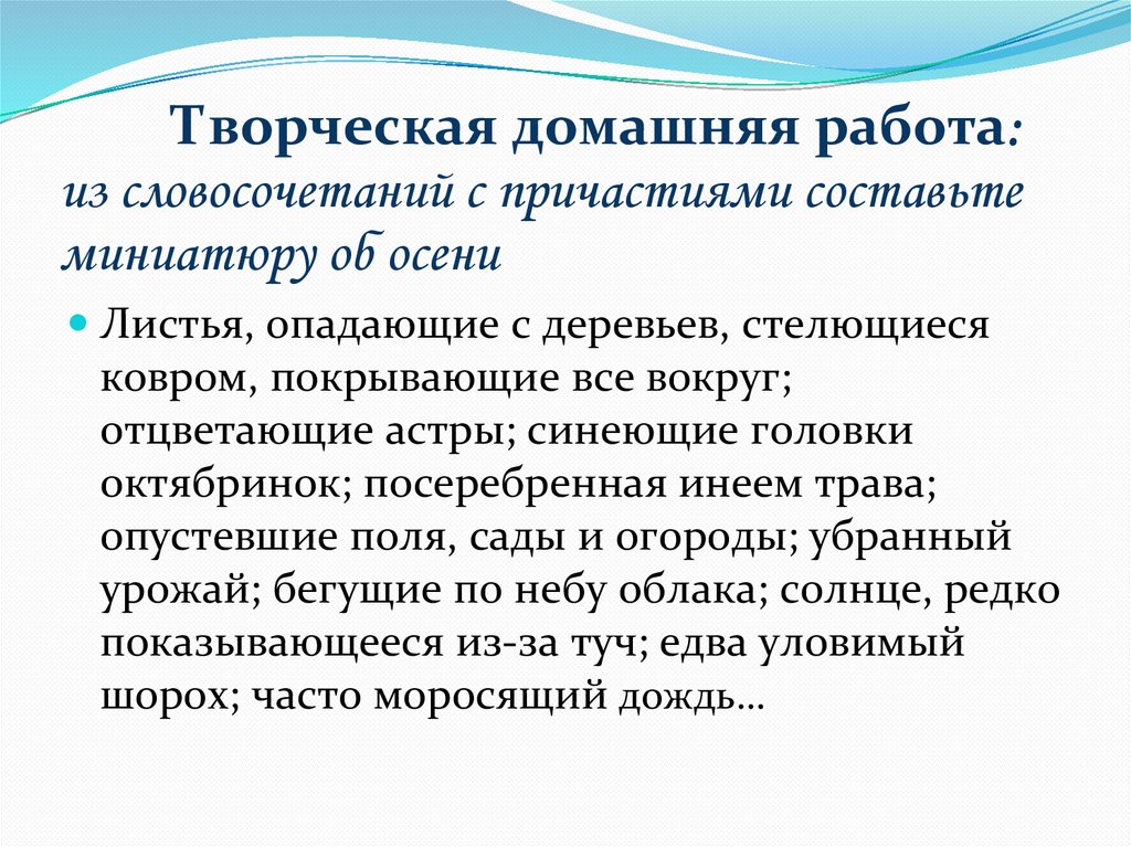 Творческая домашняя работа:из словосочетаний с причастиями составьте
