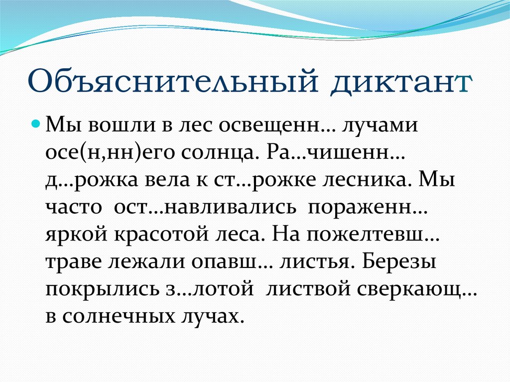 Объяснительный диктантМы вошли в лес освещенн… лучами