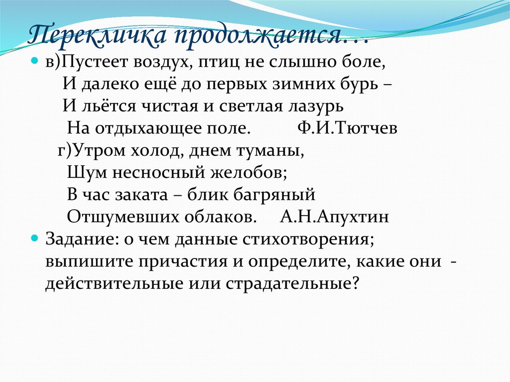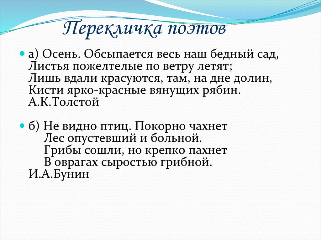 Перекличка продолжается…в)Пустеет воздух, птиц не слышно боле,