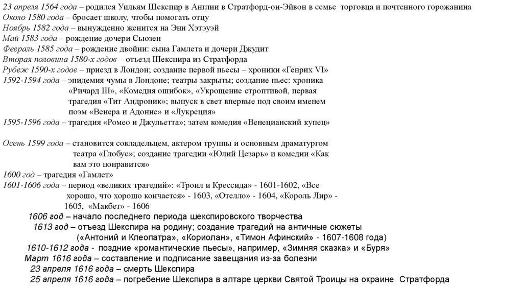 23 апреля 1564 года – родился Уильям Шекспир в Англии в Стратфорд-он-Эйвон в семье торговца и почтенного горожанинаОколо 1580 года – бросает школу, чтобы помогать отцу