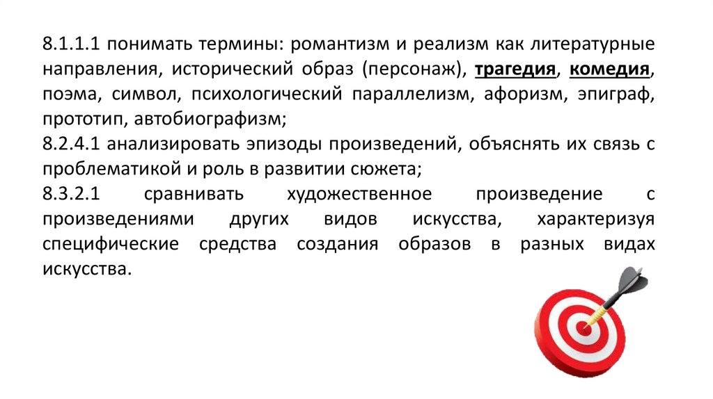 8.1.1.1 понимать термины: романтизм и реализм как литературныенаправления, исторический образ (персонаж), трагедия, комедия,