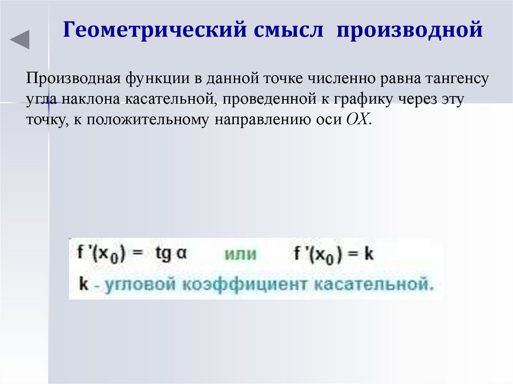 Геометрический смысл производнойПроизводная функции в данной точке численно равна тангенсу