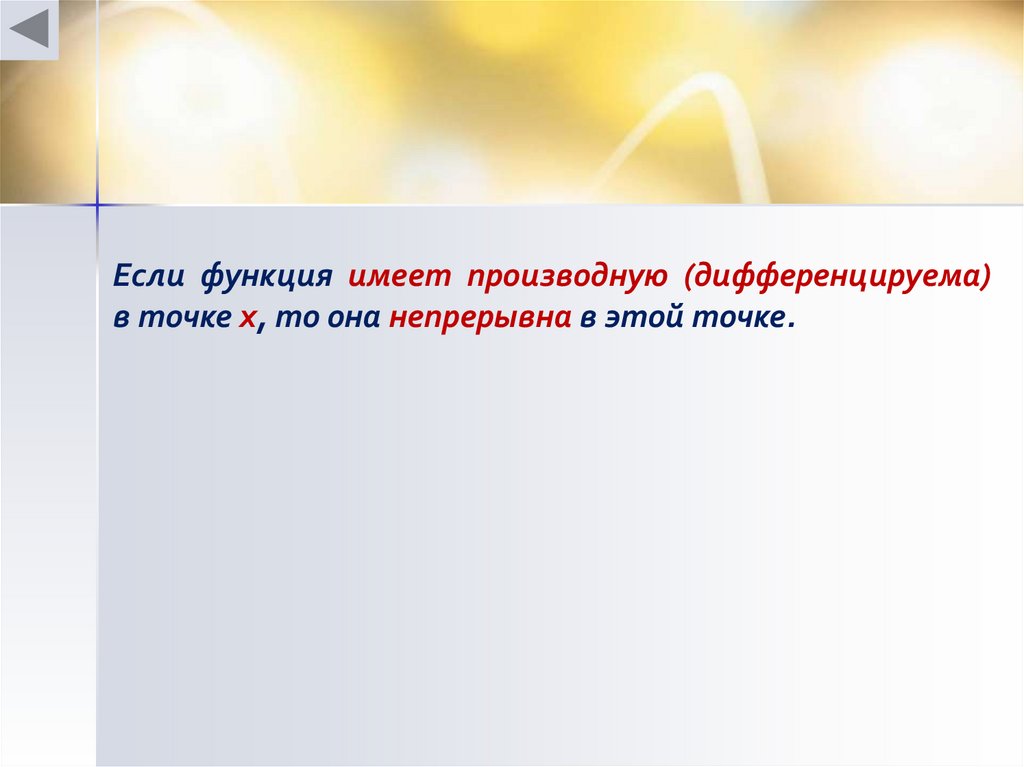 Если функция имеет производную (дифференцируема)в точке х, то она непрерывна в этой точке.