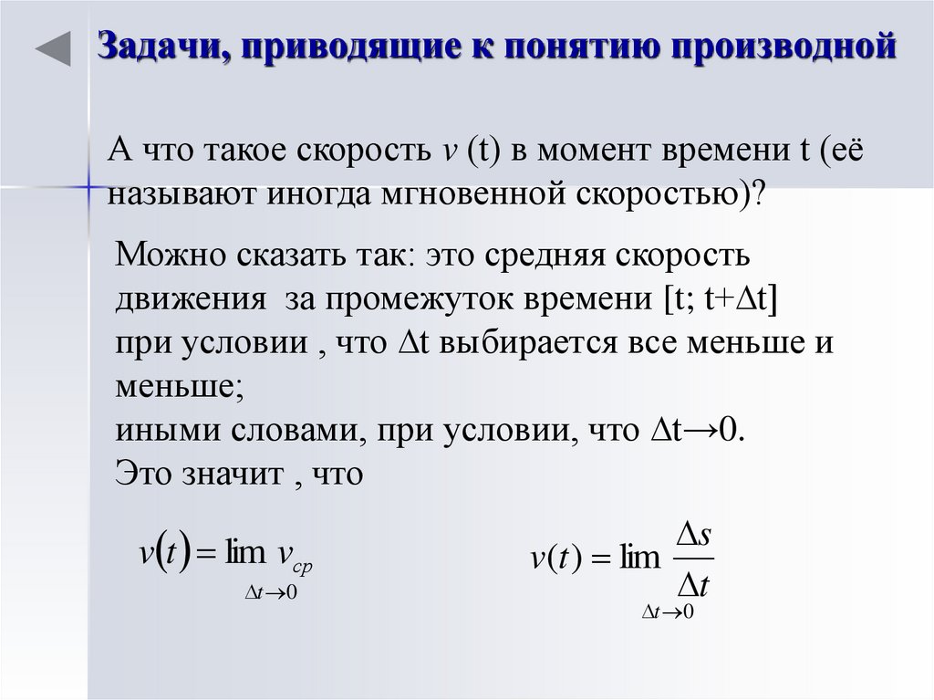 Задачи, приводящие к понятию производнойА что такое скорость v (t) в момент времени t (её
