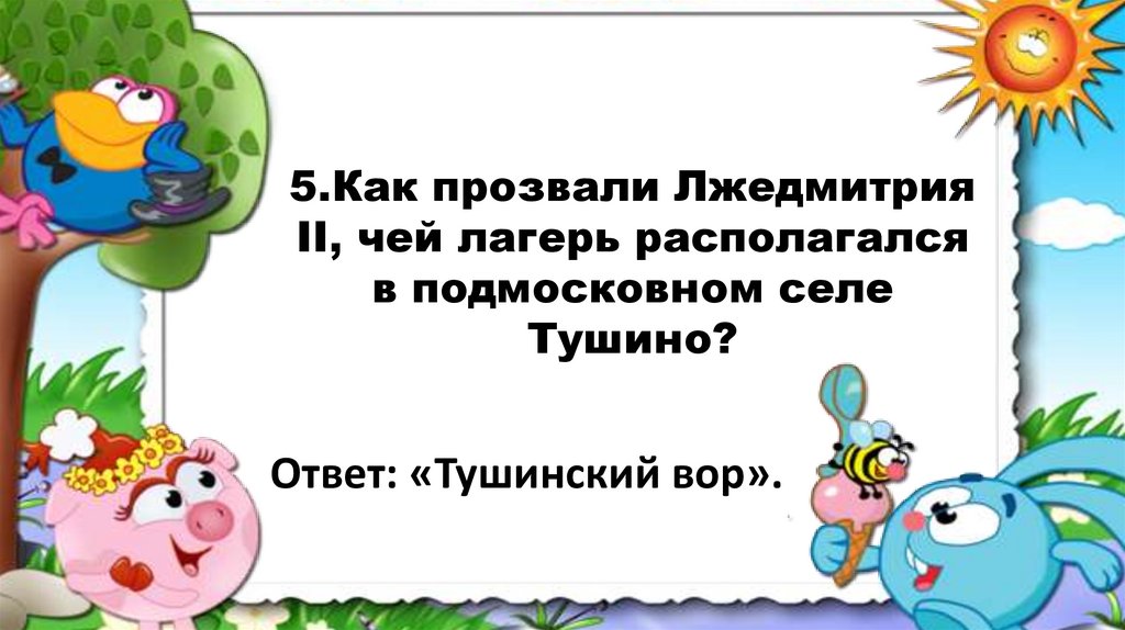 5.Как прозвали ЛжедмитрияII, чей лагерь располагался