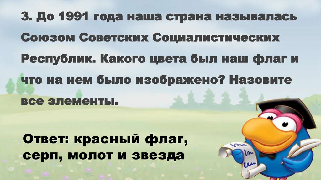3. До 1991 года наша страна называласьСоюзом Советских Социалистических