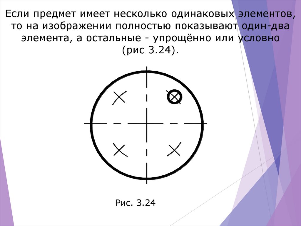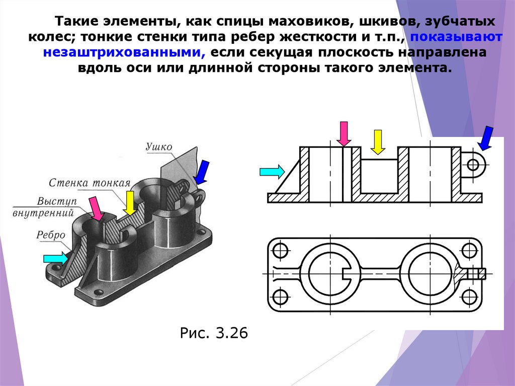Такие элементы, как спицы маховиков, шкивов, зубчатыхколес; тонкие стенки типа ребер жесткости и т.п., показывают