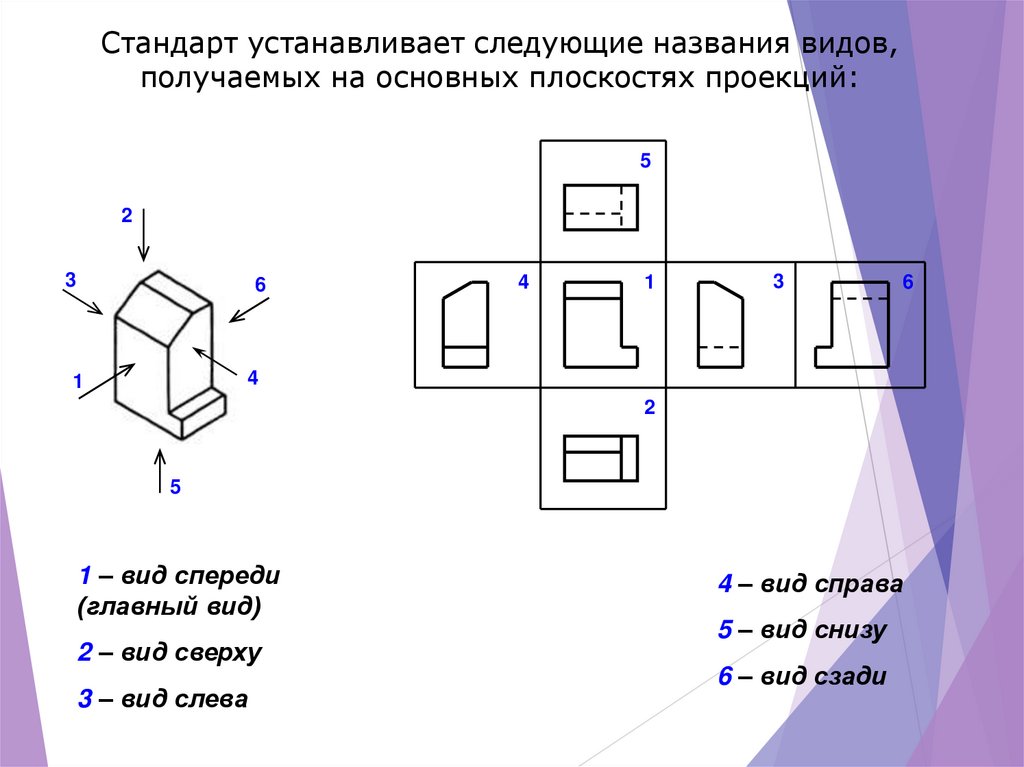 Стандарт устанавливает следующие названия видов,получаемых на основных плоскостях проекций: