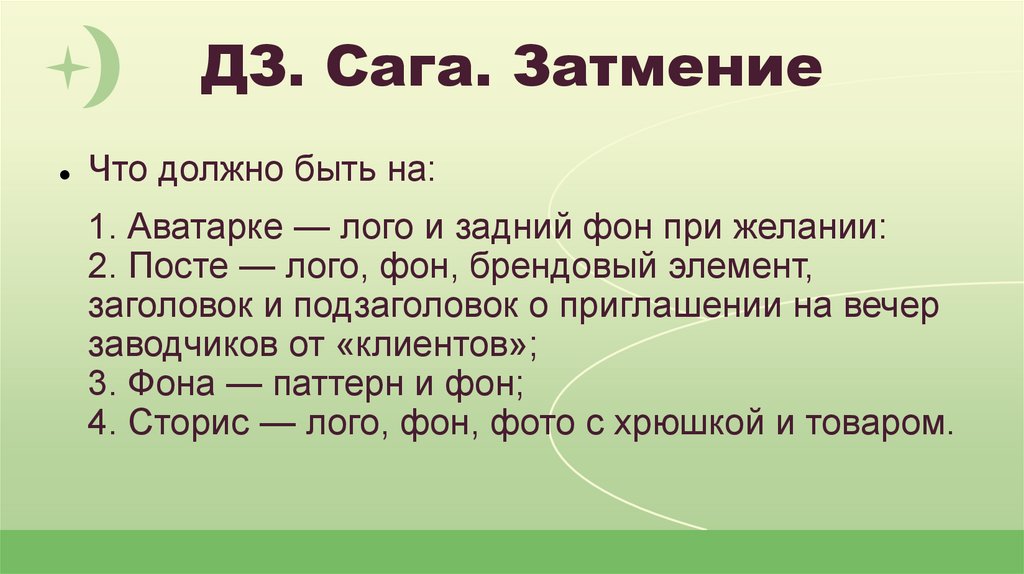 ДЗ. Сага. ЗатмениеЧто должно быть на: