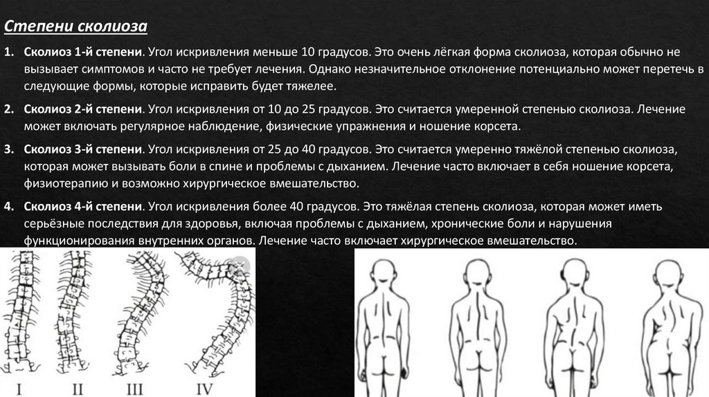 Степени сколиоза1. Сколиоз 1-й степени. Угол искривления меньше 10 градусов. Это очень лёгкая форма сколиоза, которая обычно не