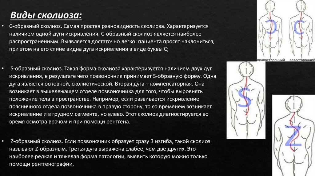 Виды сколиоза:• C-образный сколиоз. Самая простая разновидность сколиоза. Характеризуется