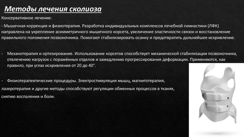 может включать регулярное наблюдение, физические упражнения и ношение корсета.