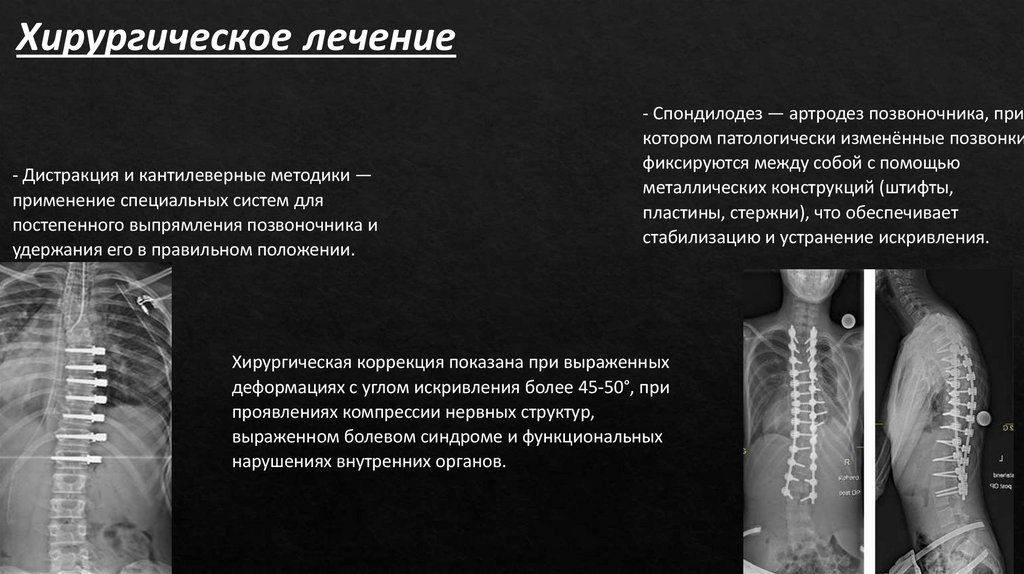 отвлечению нагрузок с поражённых отделов и замедлению прогрессирования деформации. Применяются, как