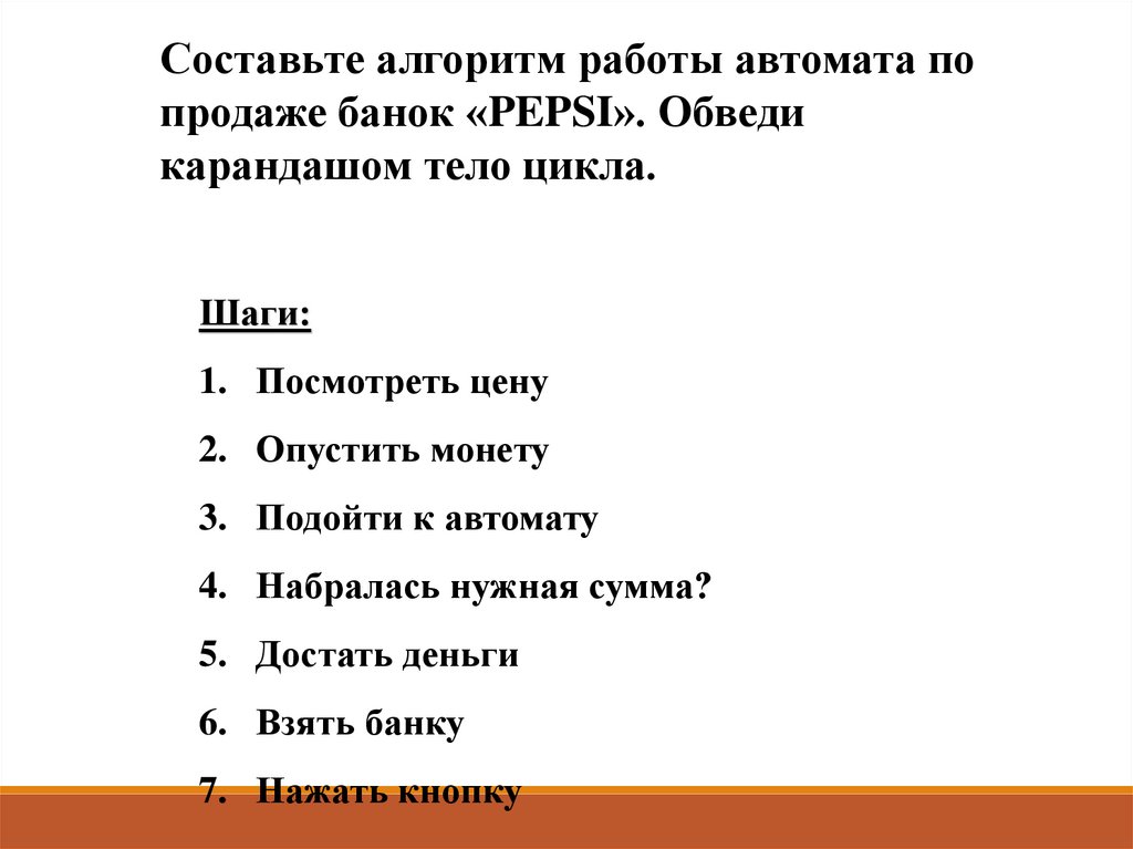 Составьте алгоритм работы автомата попродаже банок «PEPSI». Обведи