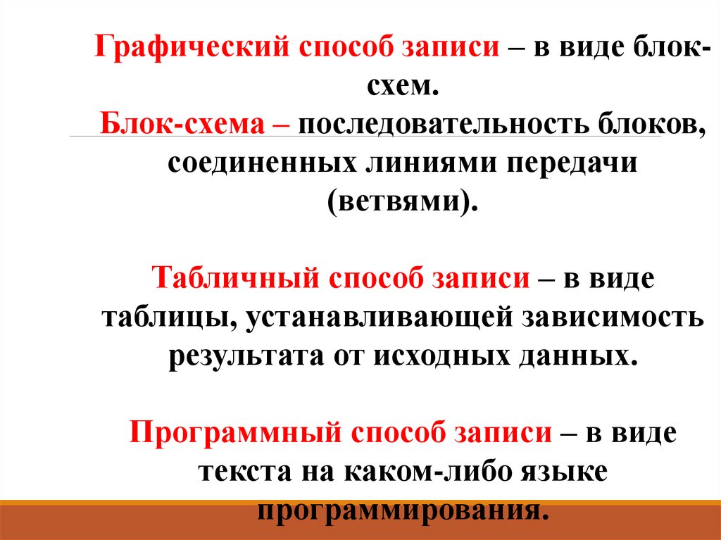 Графический способ записи – в виде блоксхем.Блок-схема – последовательность блоков,