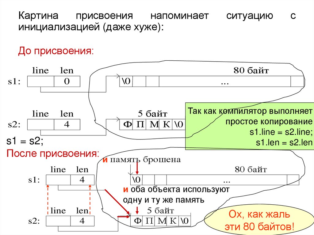 Оператор = выполняет 3 действия :1. Освобождает динамическую память у левого объекта