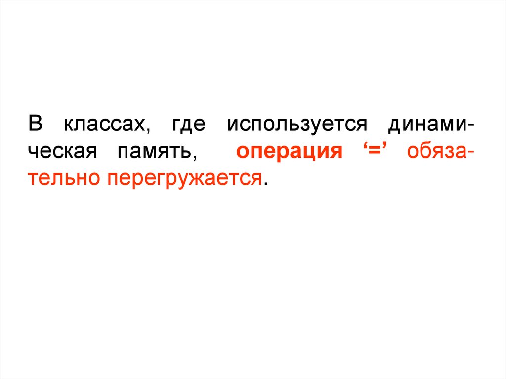 В классах, где используется динамическая память,операция ‘=’ обязательно перегружается.