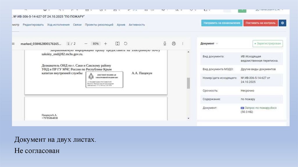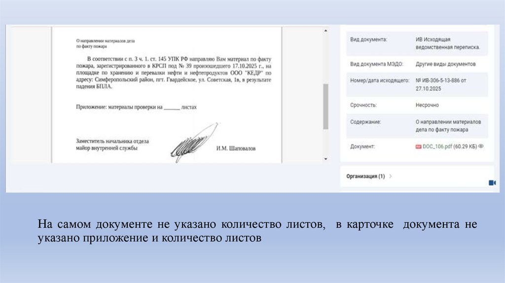 На самом документе не указано количество листов, в карточке документа неуказано приложение и количество листов