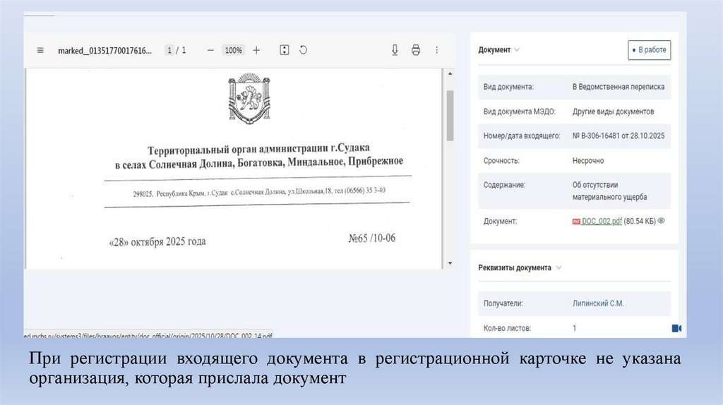При регистрации входящего документа в регистрационной карточке не указанаорганизация, которая прислала документ