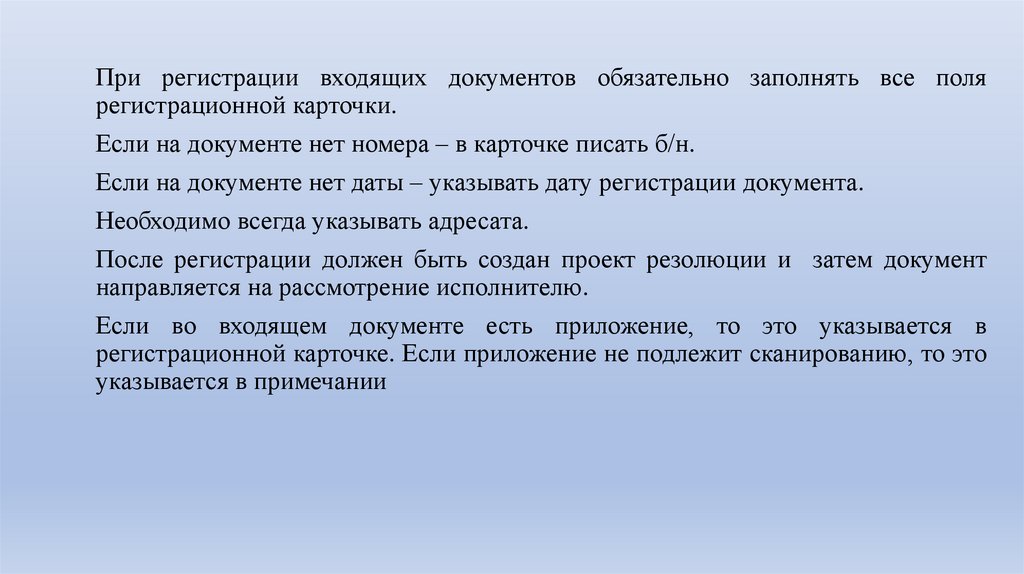 При регистрации входящих документов обязательно заполнять все полярегистрационной карточки.