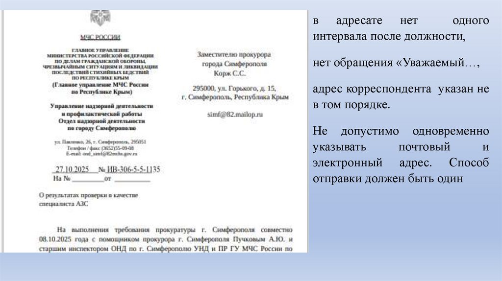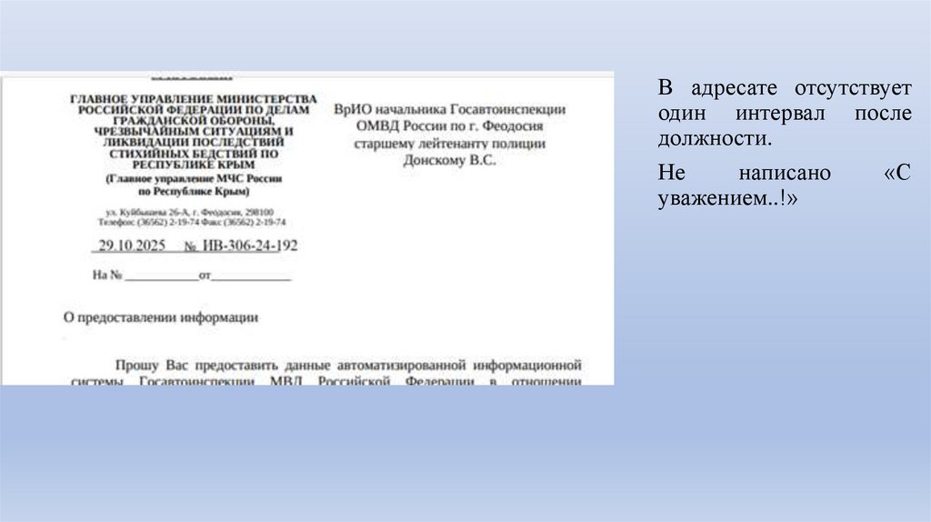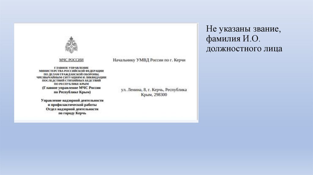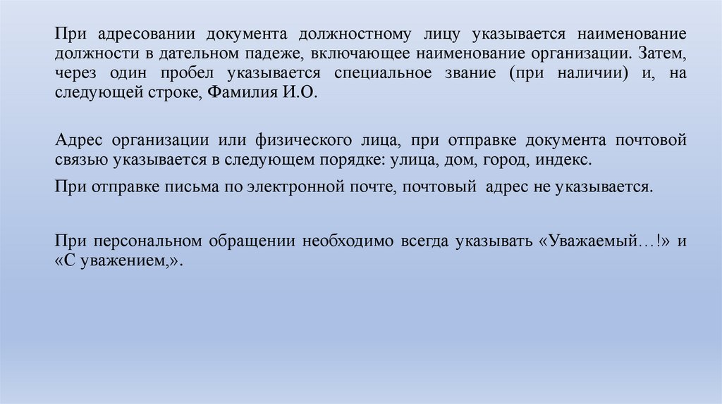 При адресовании документа должностному лицу указывается наименованиедолжности в дательном падеже, включающее наименование организации. Затем,