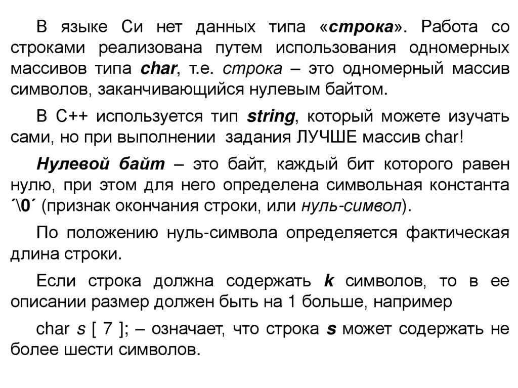 массивов типа char, т.е. строка – это одномерный массив