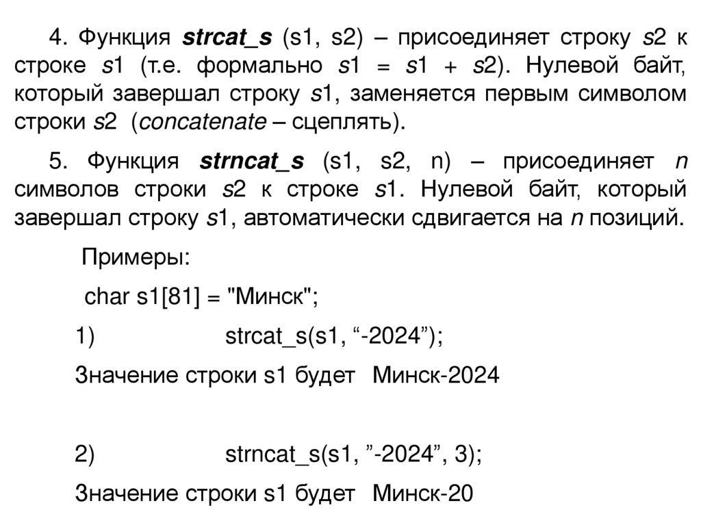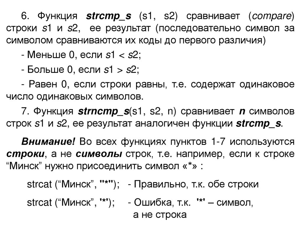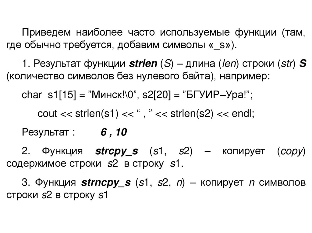Приведем наиболее часто используемые функции (там,где обычно требуется, добавим символы «_s»).