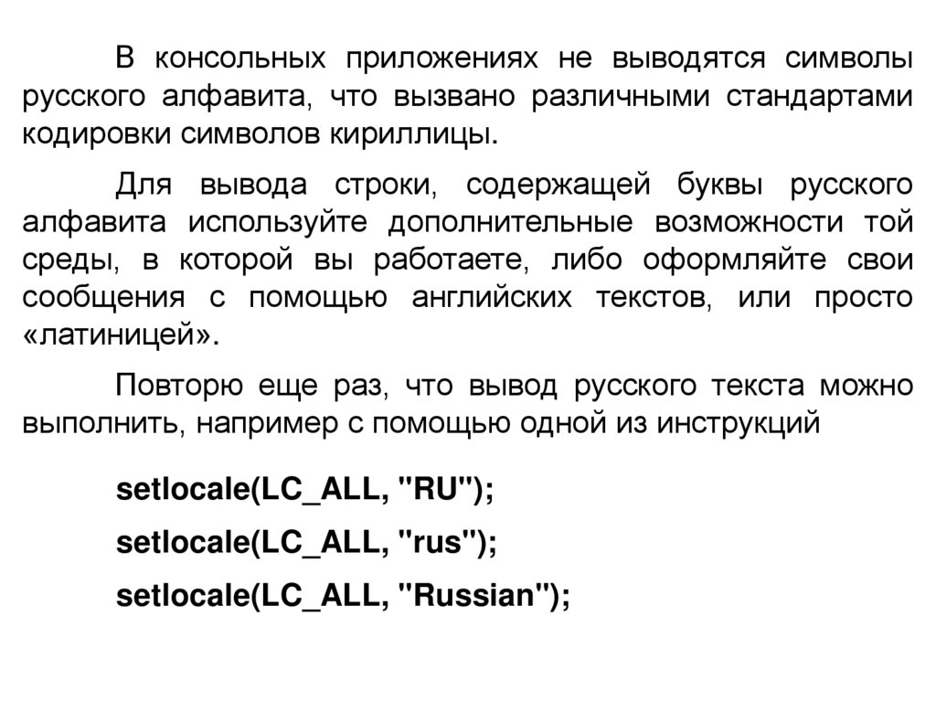Повторю еще раз, что вывод русского текста можно