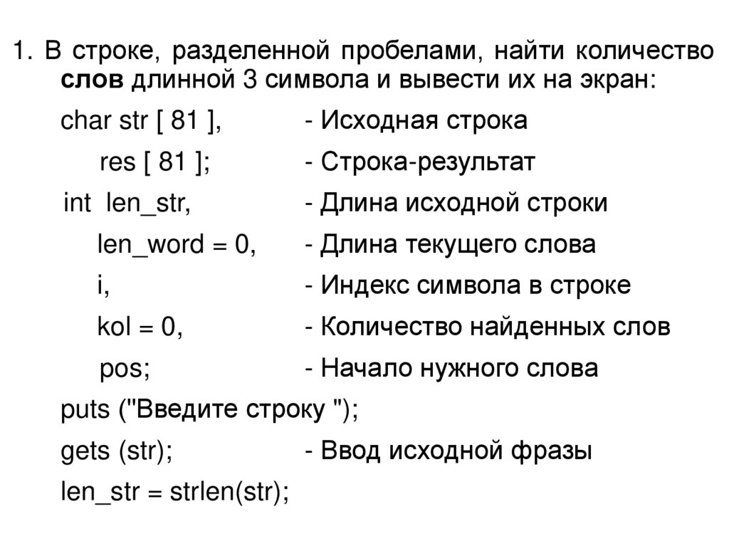 1. В строке, разделенной пробелами, найти количествослов длинной 3 символа и вывести их на экран: