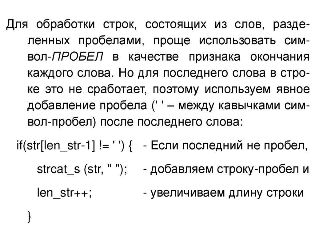 Для обработки строк, состоящих из слов, разделенных пробелами, проще использовать символ-ПРОБЕЛ в качестве признака окончаниякаждого слова. Но для последнего слова в строке это не сработает, поэтому используем явное