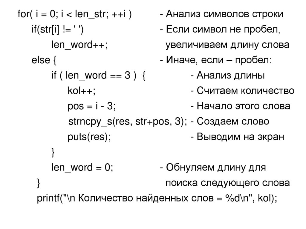 for( i = 0; i < len_str; ++i )- Анализ символов строки