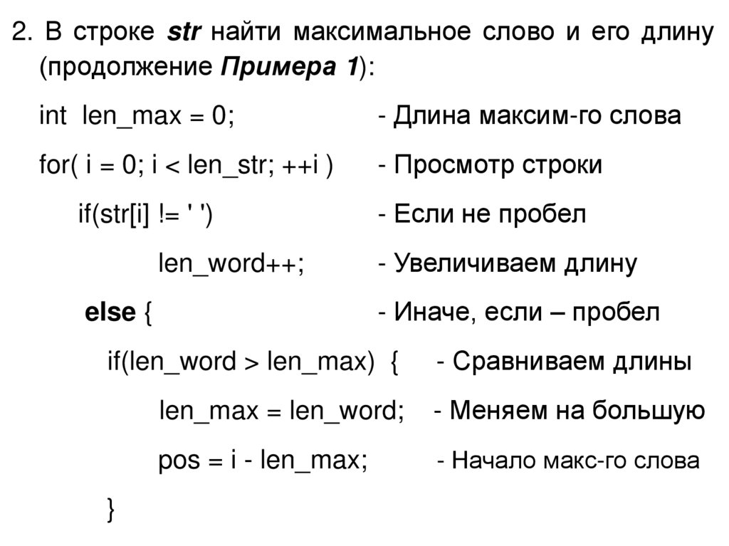 2. В строке str найти максимальное слово и его длину(продолжение Примера 1):