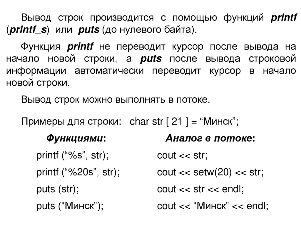 Вывод строк производится с помощью функций printf(printf_s) или puts (до нулевого байта).