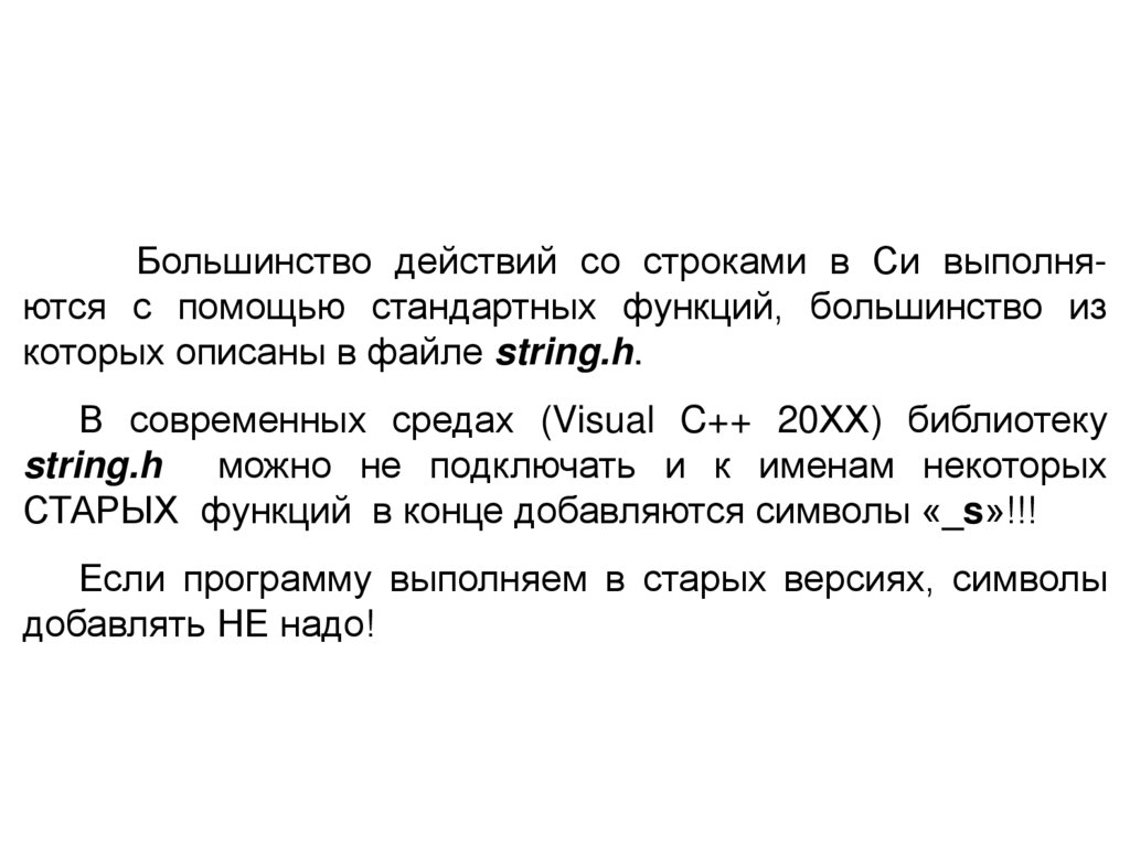 Большинство действий со строками в Си выполняются с помощью стандартных функций, большинство изкоторых описаны в файле string.h.