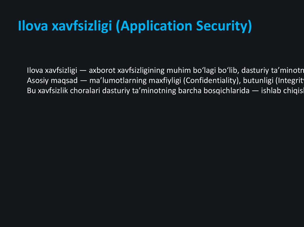 Ilova xavfsizligi (Application Security)Ilova xavfsizligi — axborot xavfsizligining muhim bo‘lagi bo‘lib, dasturiy ta’minotn