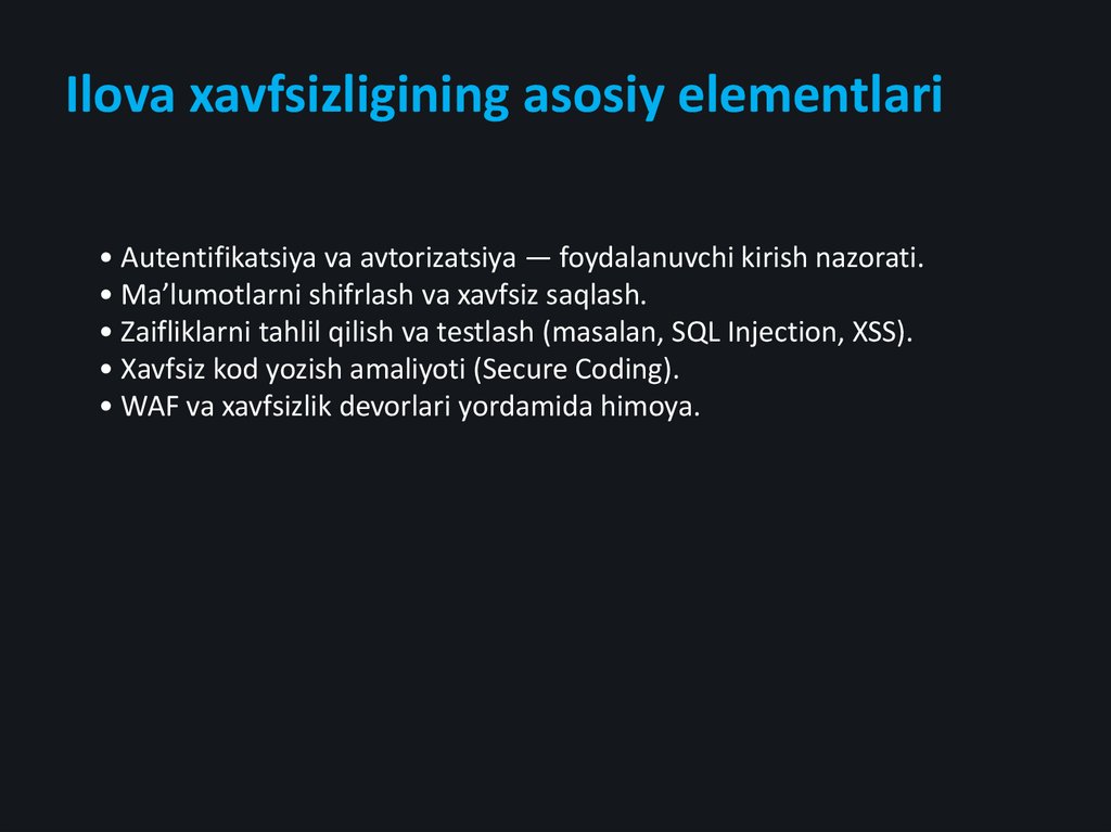 Ilova xavfsizligining asosiy elementlari• Autentifikatsiya va avtorizatsiya — foydalanuvchi kirish nazorati.