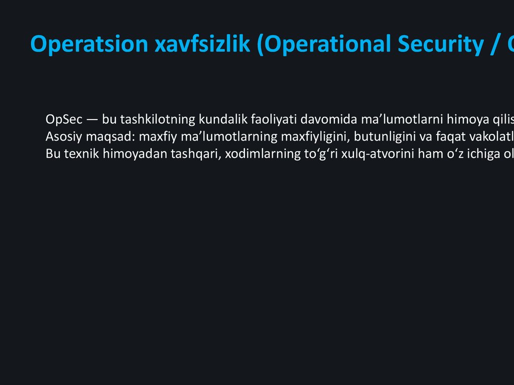 Operatsion xavfsizlik (Operational Security / OOpSec — bu tashkilotning kundalik faoliyati davomida ma’lumotlarni himoya qilis