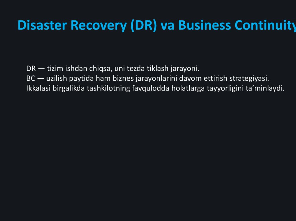 Disaster Recovery (DR) va Business ContinuityDR — tizim ishdan chiqsa, uni tezda tiklash jarayoni.
