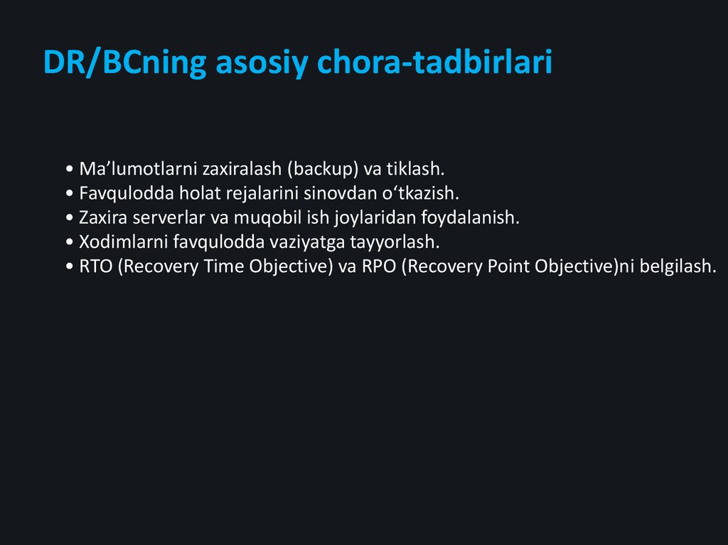DR/BCning asosiy chora-tadbirlari• Ma’lumotlarni zaxiralash (backup) va tiklash.