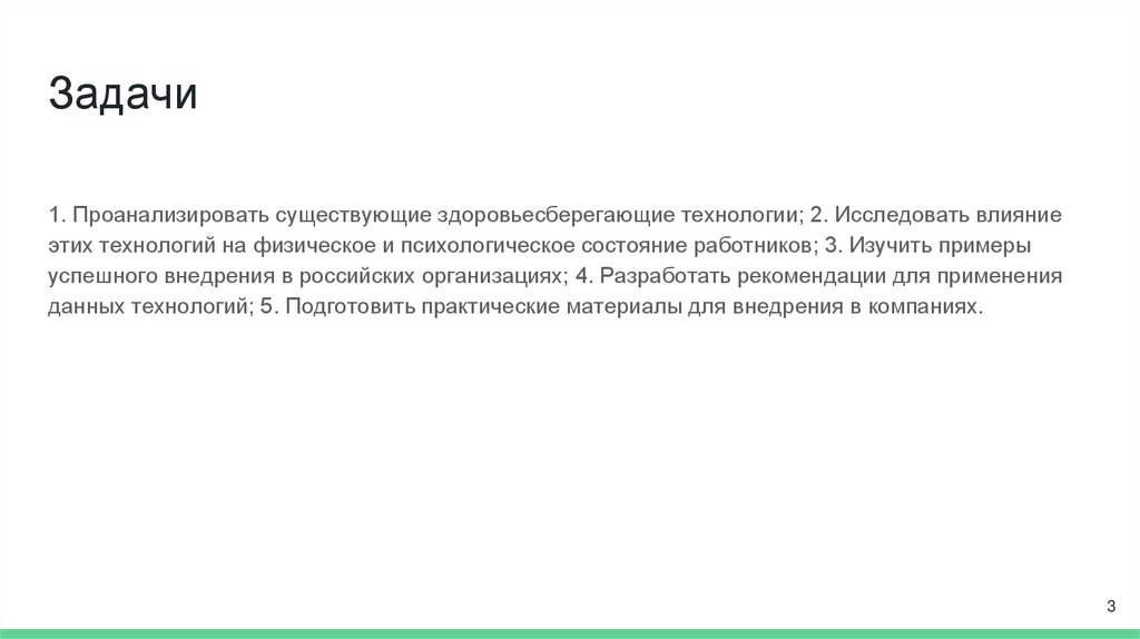 Задачи1. Проанализировать существующие здоровьесберегающие технологии; 2. Исследовать влияние